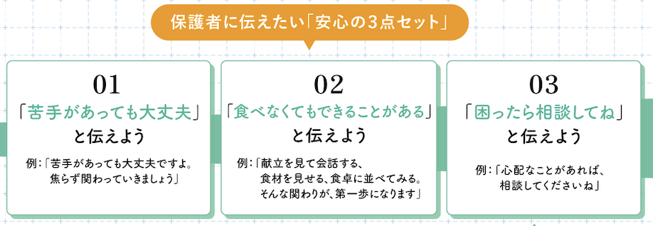 今回は、保護者の本音や困りごとを理解した上で、子どもの「食べてみようかな」を育てるために先生が伝えられる『安心の3点セット』について解説します。