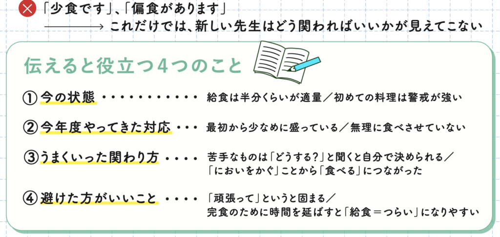「少食です」「偏食があります」だけでなく、「どう関わればいいか」まで伝えることで、新担任は初日からスムーズに対応できます。