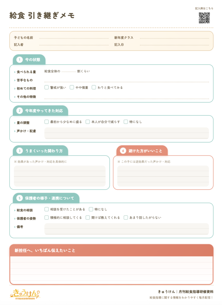 ▶︎「給食 引き継ぎメモ」テンプレートのダウンロードはこちら(無償で印刷・配布OKです)
